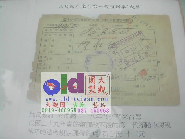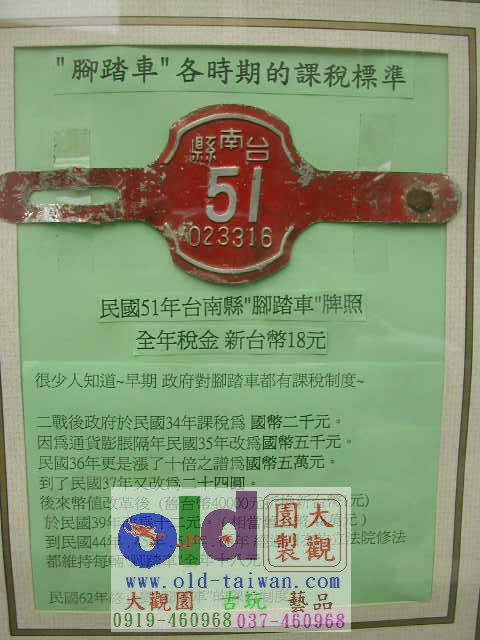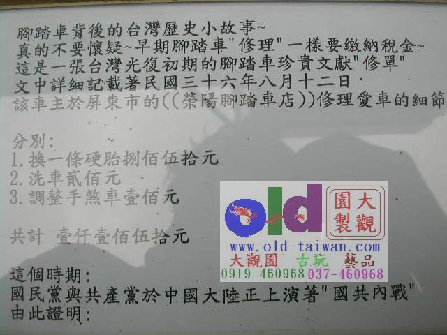 其中,日治時代昭和富士「霸王車」算是展出的車種當中很能反映時代的表徵,當時一分地價值100元,一台進口的富士霸王車行情就有30元,等同於現代賓士車的尊貴,車主每年還得繳交18元的稅金哩。原來在那個年代,騎鐵馬還得繳稅。