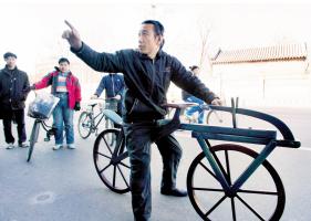 昨天,市民安忠林按照法国人西夫拉克1790年发明的世界上第一辆木制自行车图样,