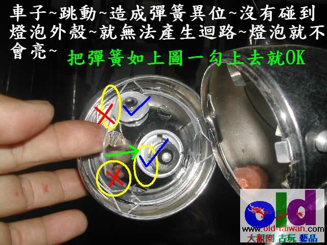 5.如果不是短路~那麼大燈不亮~打開檢查一下~中間的彈簧鋼絲有沒有掉~把他勾上大燈炮的座上~