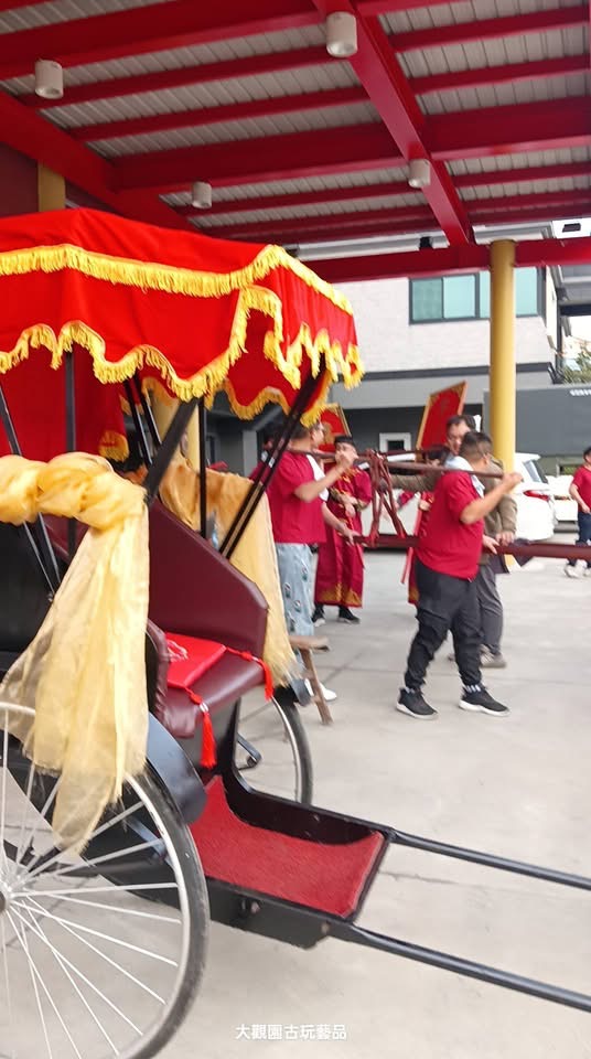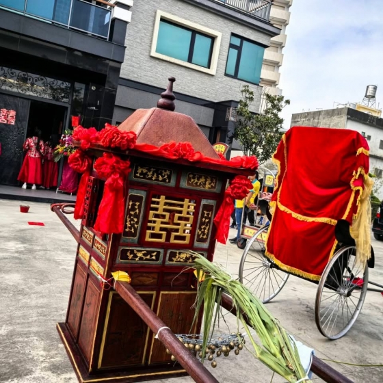 為此特別再打造一套八人轎伕的扛棍,全部過程都遵循古禮進行,畢竟兩地之間也有一段距離,為了符合傳統囍轎婚禮的禁忌,轎不落地。